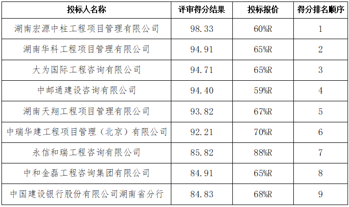 经评标委员会认真评审及我司对入围单位投标报价、技术力量、信用评价等综合考量,年度工程造价咨询服务合作单位库9家入库单位分别为:湖南宏源中柱工程项目管理有限公司、湖南华科工程项目管理有限公司、大为国际工程咨询有限公司、中邮通建设咨询有限公司、湖南天翔工程项目管理有限公司、中瑞华建工程项目管理(北京)有限公司、永信和瑞工程咨询有限公司、中和金磊工程咨询集团有限公司、中国建设银行股份有限公司湖南省分行。